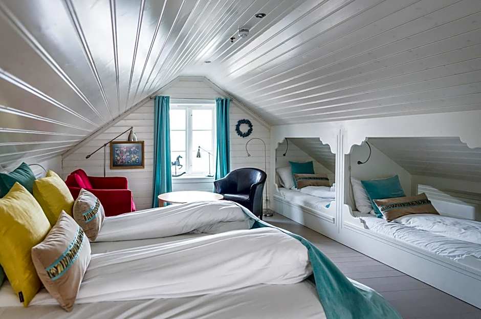 This attic room comes with a sitting area, a private bathroom and views out towards the mountains.